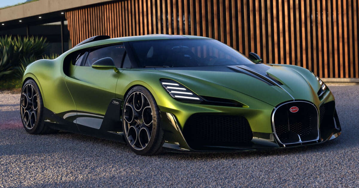 Much of a car’s perception comes from its upper two-thirds, says Bugatti, and so the Brouillard has its lower third rendered in a darker shade that offers a connection to the car’s shadow, aiding in a lower, longer look while also making the wheels appear larger.